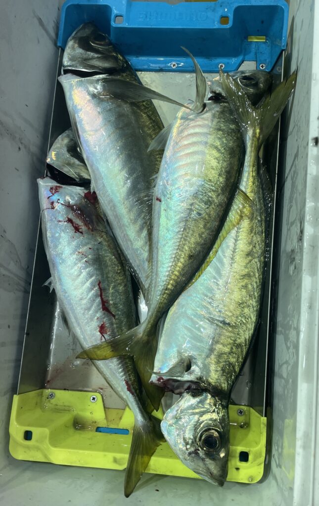 マイカ39杯、デカ鯵9と大漁釣果でした。水深95m、ヒットする棚は40~50mで安定し22時までにはマイカは満足、バチコンで鯵狙いすると入れ食いでクーラー満タンで終わりました。イカメタル続けた人は60杯以上あげてました。